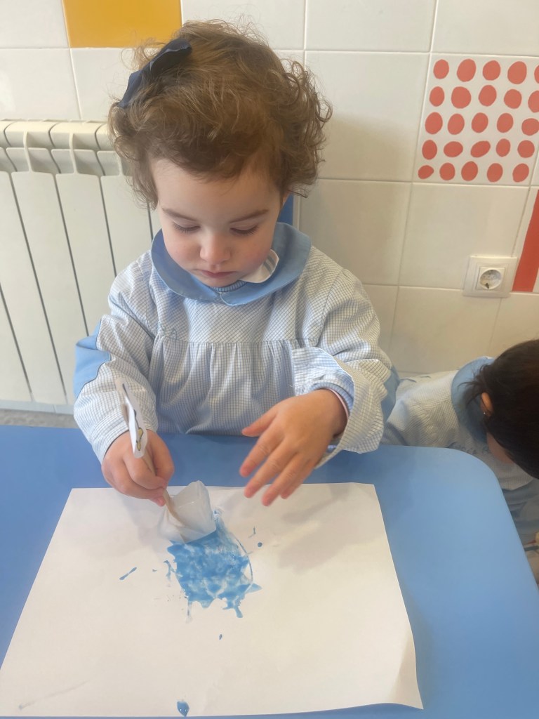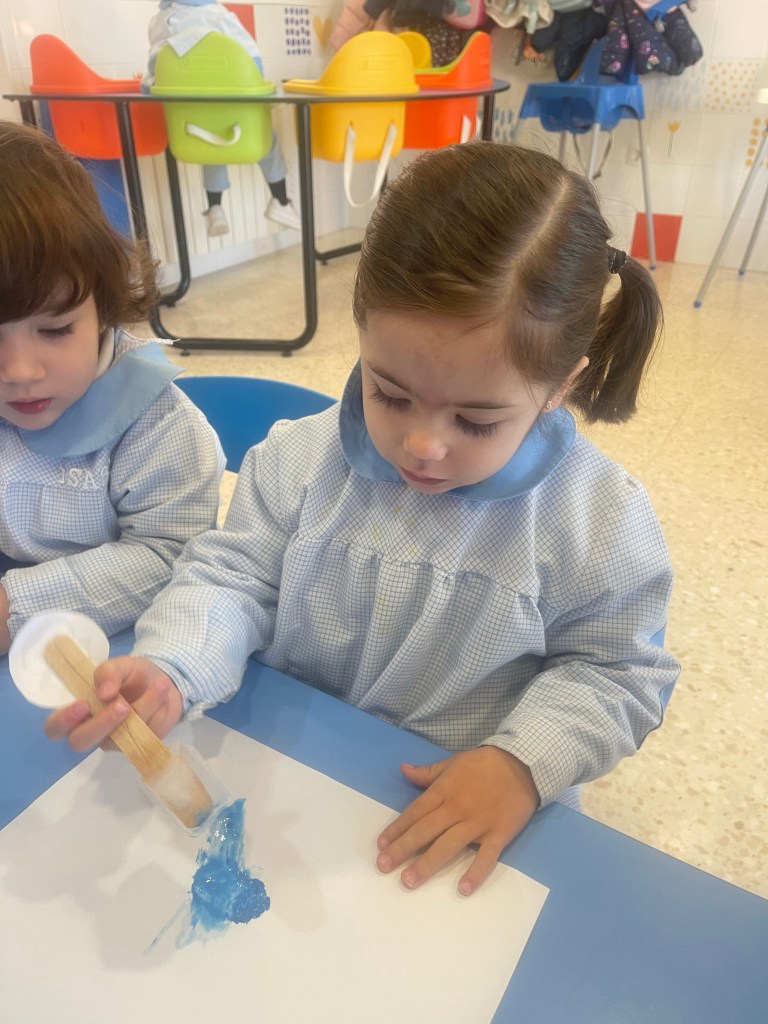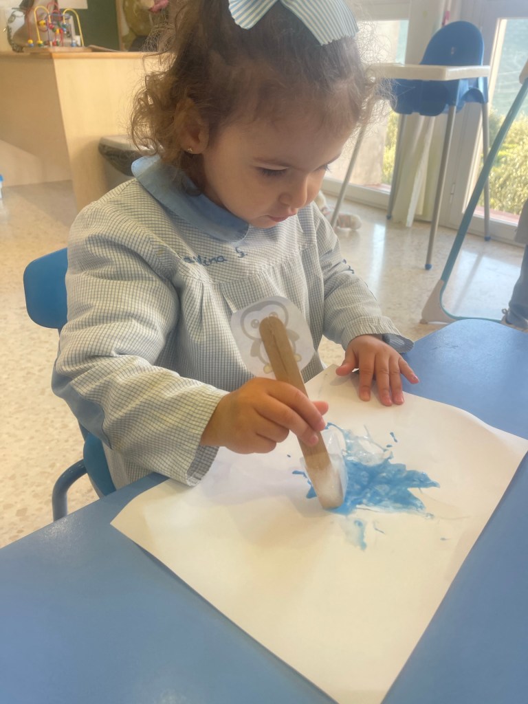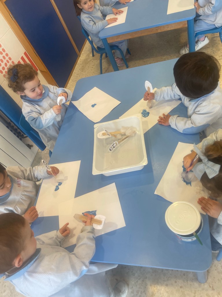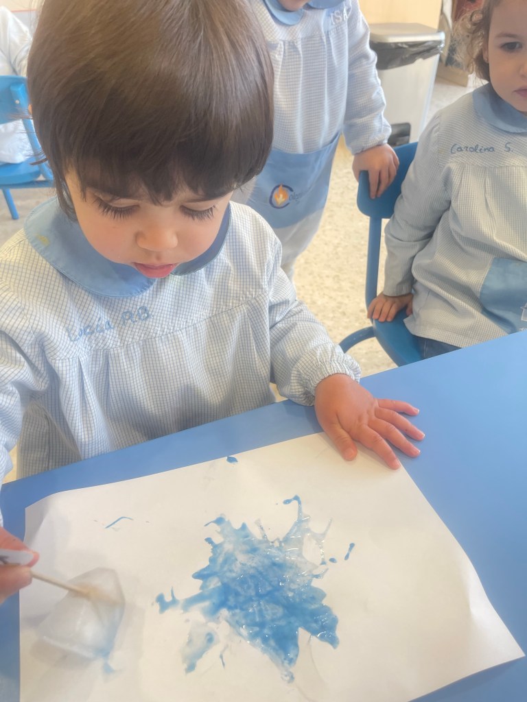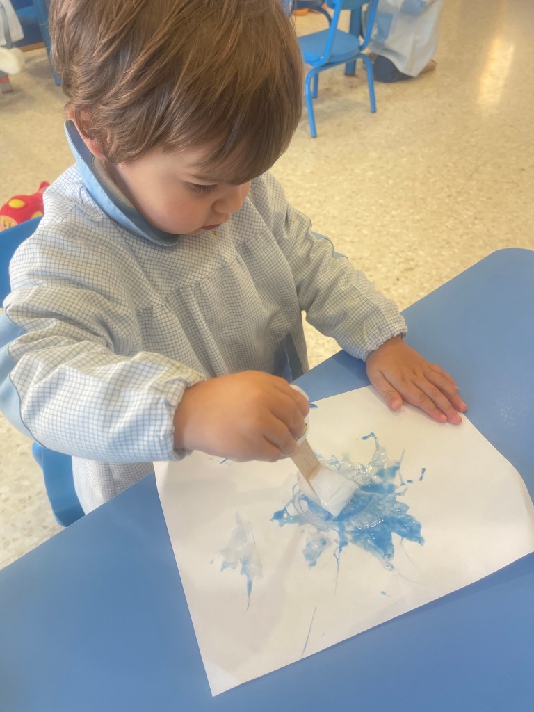 Hemos usado agua , sal y pincel para poder hacer nuestros copos de nieve !